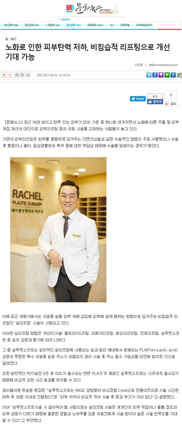 문화뉴스] 최근 어려 보이고 탄력 있는 피부가 미의 기준 중 하나로 여겨지면서 노화에 따른 주름 및 피부 처짐 개선의 대안으로 피부리프팅 등의 의료 시술을 고려하는 사람들이 늘고 있다. 기존의 피부리프팅은 피부를 팽팽하게 당겨주는 안면거상술과 같은 수술적인 방법이 주로 사용됐으나 수술 후 통증이나 흉터, 일상생활로의 복귀 등에 대한 부담감 때문에 수술을 망설이는 경우가 많았다. 이에 최근 개원가에서는 의료용 실을 피부 속에 삽입해 피부에 걸쳐 원하는 방향으로 당겨주는 비침습적 리프팅인 ‘실리프팅’ 시술이 시행되고 있다. 이러한 실리프팅 방법은 TR라인시술, 울트라V리프팅, 오메가리프팅, 회오리리프팅, 민트리프팅, 실루엣소프트 등 실의 성분과 돌기에 따라 나뉜다. 그 중 실루엣소프트는 일반적인 실리프팅에 사용되는 실과 달리 체내에서 분해되는 PLA(Poly-Lactic acid) 성분의 투명한 특수 의료용 실로 색소가 포함되지 않아 시술 후 색소 흡수 가능성을 미연에 방지한 것으로 알려졌다. 또한 일반적인 PDO실은 8주 후 50%가 흡수되는 반면 PLA가 주 재료인 실루엣소프트는 12주까지 흡수되기 때문에 비교적 오랜 시간 효과를 유지할 수 있다. 레이첼의원 유승원 원장은 “실루엣소프트는 360도 양방향의 비고정형 Cone으로 만들어졌으며 시술 시간은 마취 후 30분 이내로 진행된다”며 “피부 자극이 비교적 적어 시술 후 멍과 부기가 거의 없다”고 설명했다. 이어 “실루엣소프트시술 시 알아둬야 할 사항으로는 실리프팅 시술은 개개인의 피부 처짐이나 볼륨 정도와 피부 상태가 다르기 때문에 충분한 경험과 노하우를 갖춘 의료진에게 시술 받아야 높은 시술 만족도를 기대할 수 있다”고 부연했다.